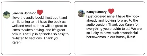 Not only will you get to hear everything in the book read with Karen's voice (and passion), you will get additional commentary and stories. It's Dressage Naturally like you've never heard it before.